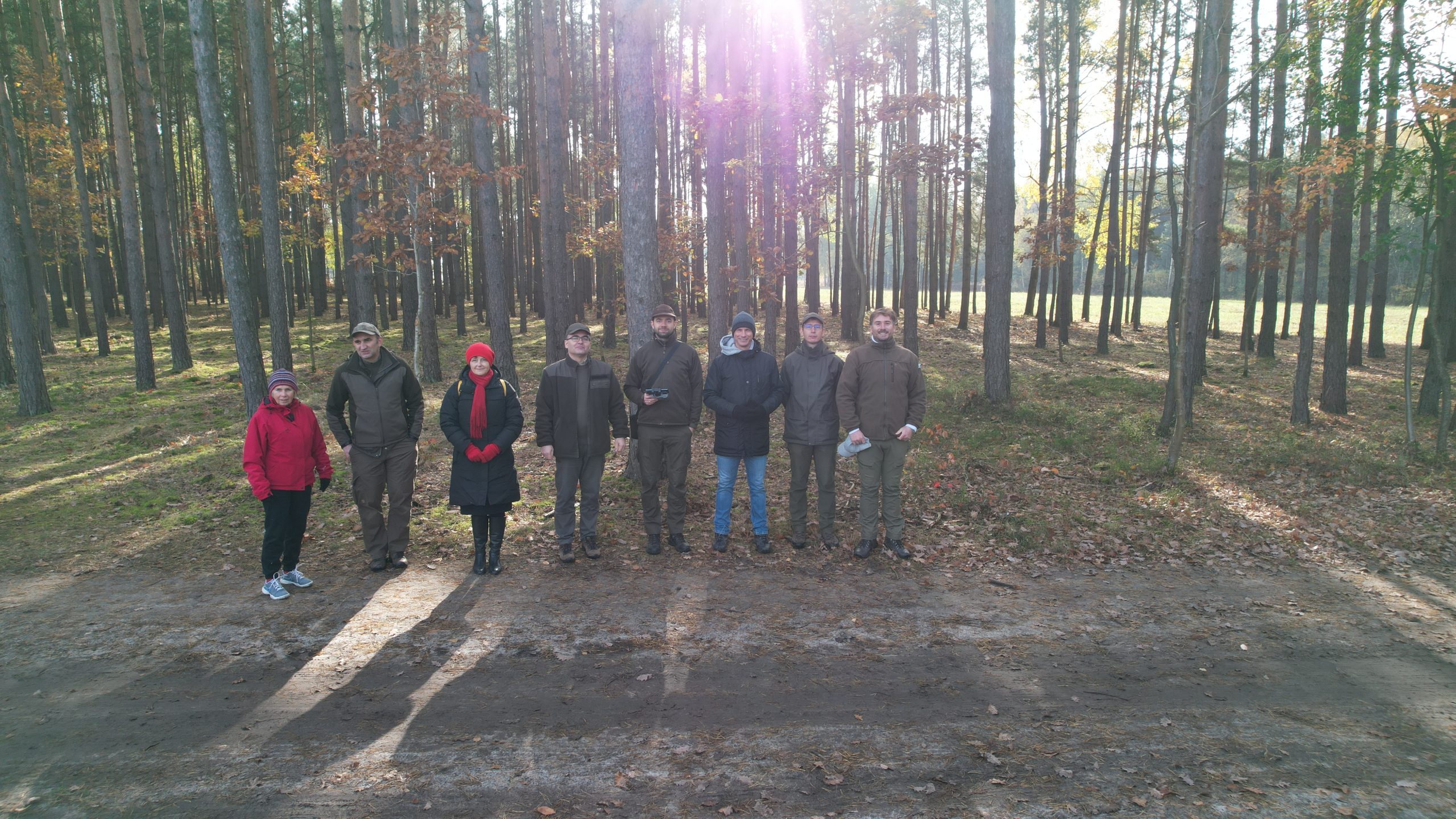 Las, osiem osób stoi na ścieżce i pozuje do zdjęcia