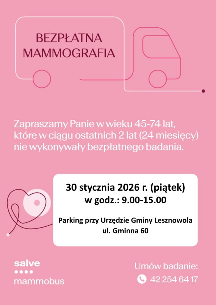 Mammobus będzie czekał w piątek 30 stycznia 2026 r. na parkingu przy Urzędzie Gminy Lesznowola ul. Gminna 60 w godz.: 9-15.00.