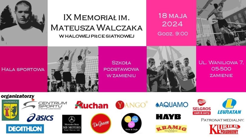 W sobotę 18 maja o godz. 9.00 odbędzie się IX Memoriał im. Mateusza Walczaka.Zapraszamy do hali SP w Zamieniu, ul. Waniliowa 7.
