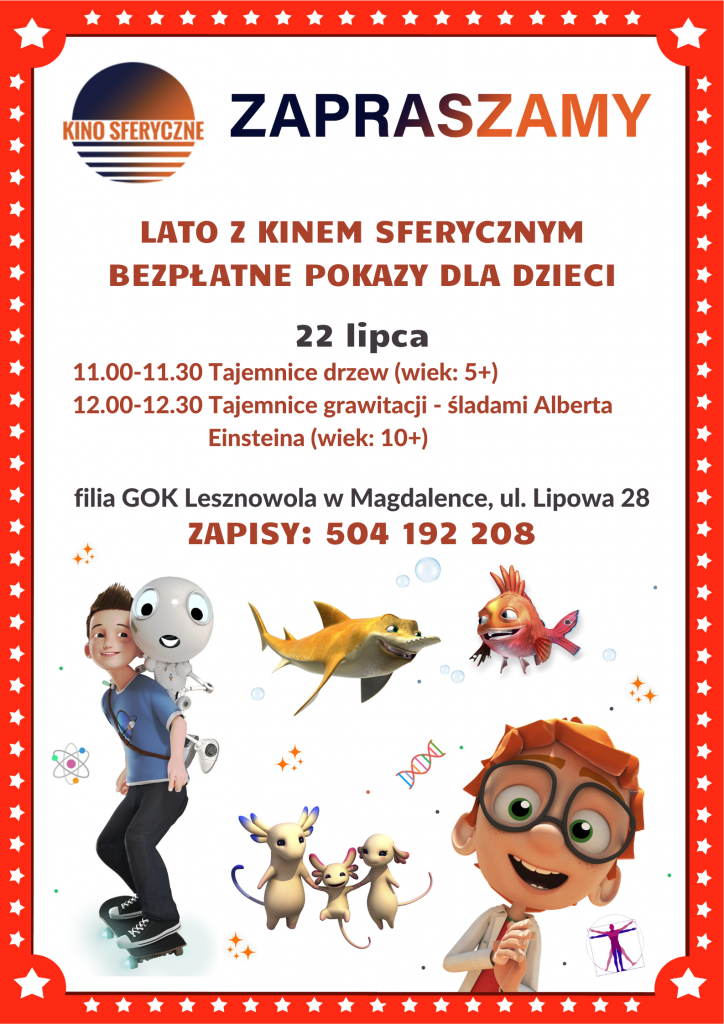 W piątek 22 lipca zapraszamy dzieci na wyjątkowe seanse w sferycznym kinie pod kątem 360º: Miejsce: filia GOK Lesznowola w Magdalence, ul. Lipowa 28. Obowiązują zapis: 504 192 208