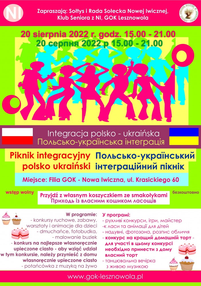 W sobotę 20 sierpnia 2022 r. w godz. 15.00-21.00 odbędzie się Sołecki Piknik Integracyjny polsko – ukraiński dla całych rodzin, z wieczorną potańcówką. Zapraszamy do ogrodu filii GOK Lesznowola w Nowej Iwicznej, ul. Krasickiego 60. Wstęp wolny!