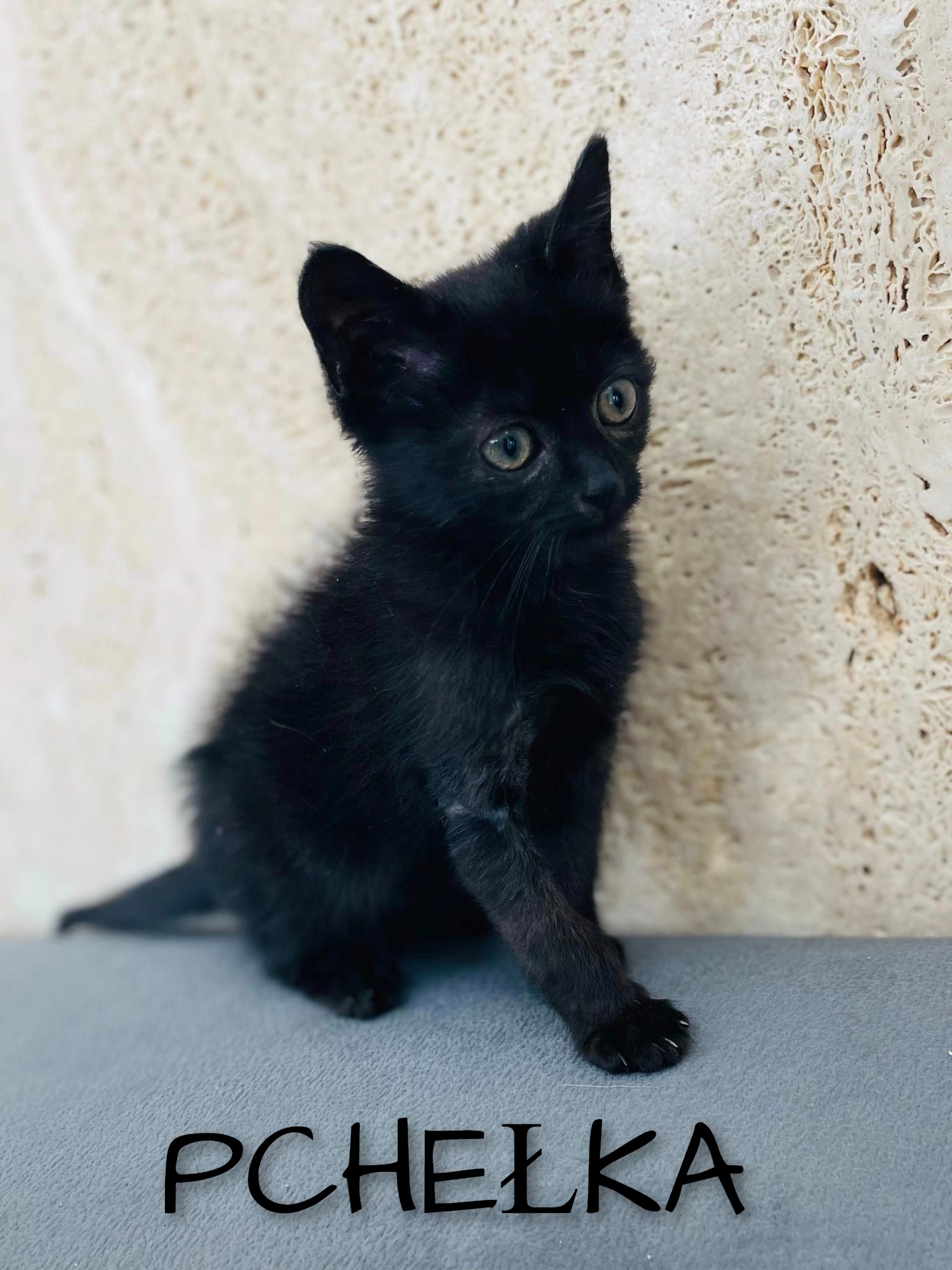Czarna kotka i napis Pchełka.