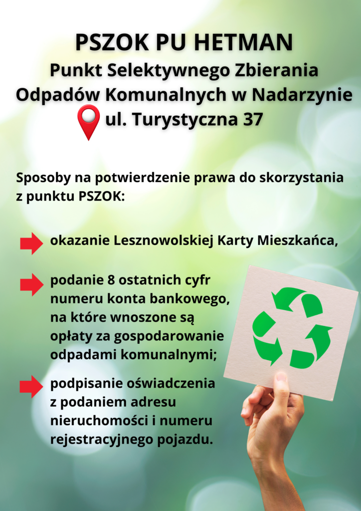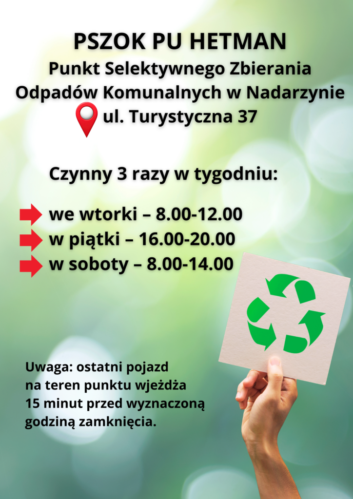 Punkt Selektywnej Zbiórki Odpadów Komunalnych znajduje się przy ul. Turystycznej 37 w Nadarzynie.