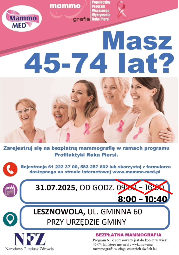 Informujemy, iż z powodu problemów technicznych (awaria aparatu w innym mammobusie), czas zaplanowanych na jutro (31 lipca) w godz. 9.00-16.00 badań mammograficznych zostanie skrócony – odbędą się one w godzinach 8.00-10.40.