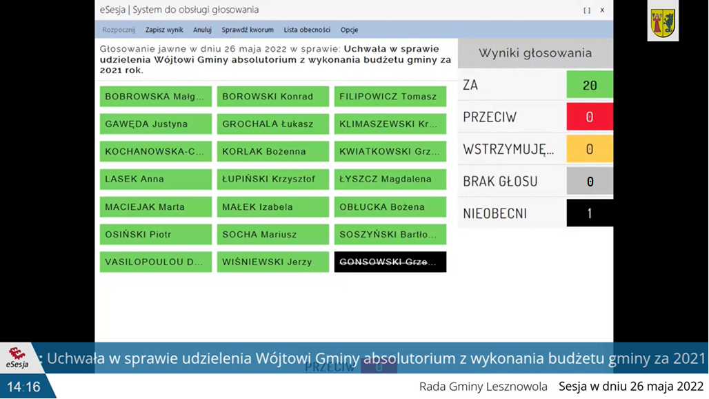 W głosowaniach nad wotum zaufania oraz nad absolutorium wzięło udział 20 Radnych (jedna osoba była nieobecna), sesja odbyła się w trybie zdalnym. Transmisję z Sesji Absolutoryjnej (oraz relacje z innych Sesji) można zobaczyć na kanale https://esesja.tv/transmisja_na_zywo/712/rada-gminy-lesznowola.htm
