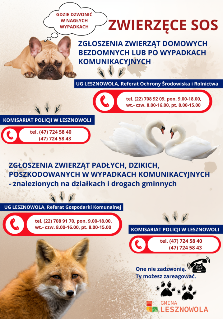 Przypominamy o obowiązujących telefonach alarmowych w przypadku znalezienia na terenie naszej Gminy błąkających się, rannych lub padłych zwierząt.